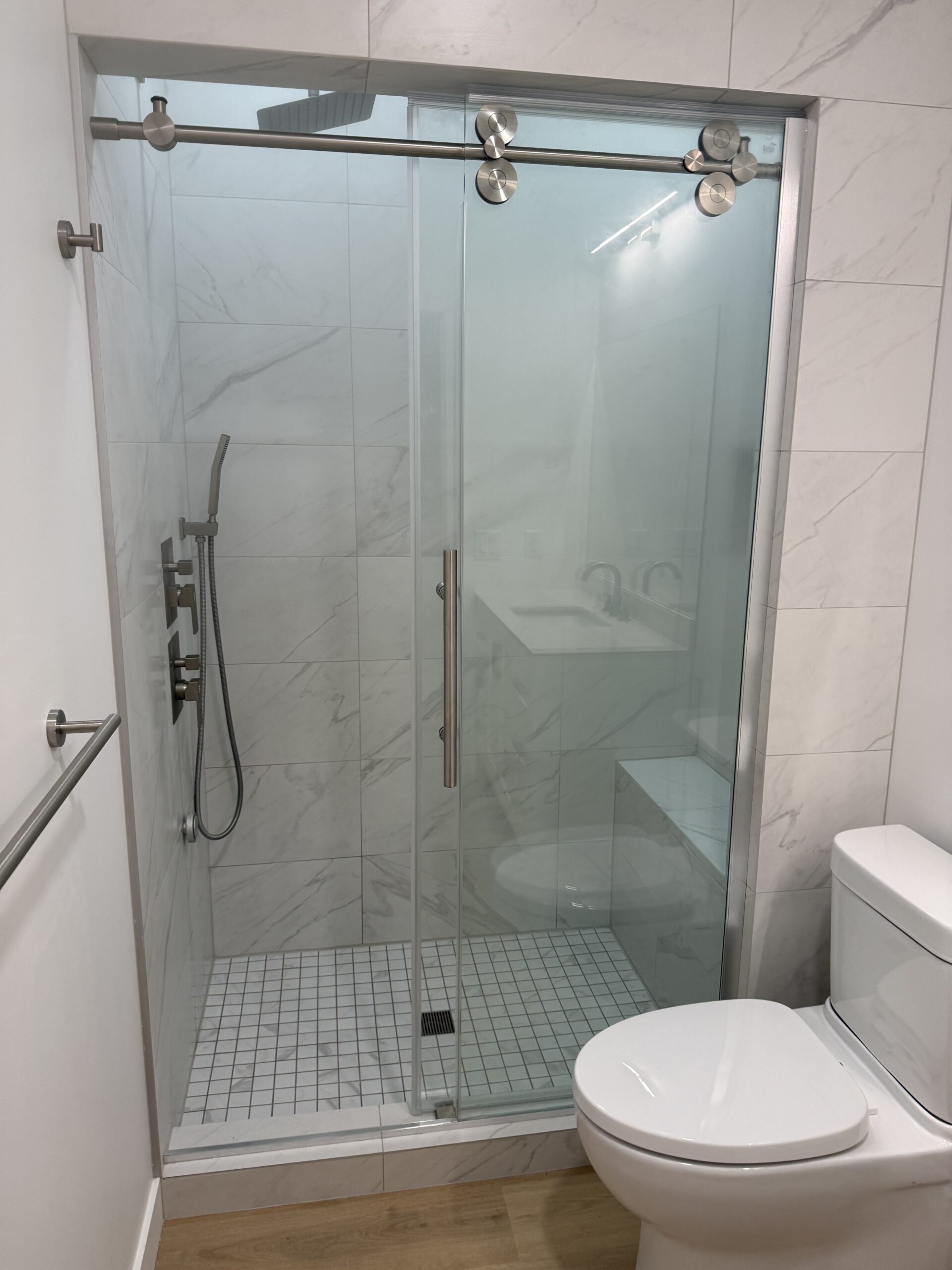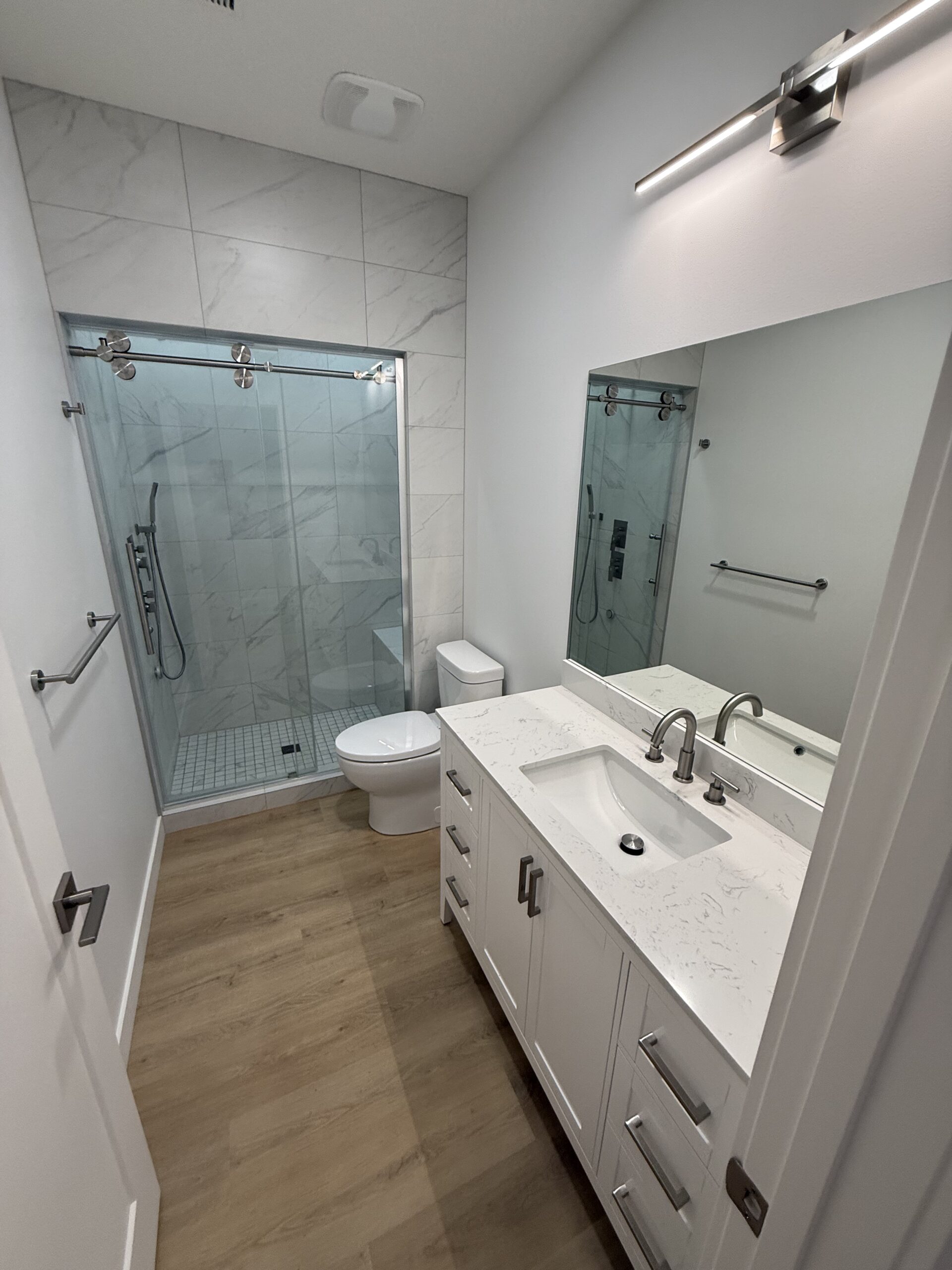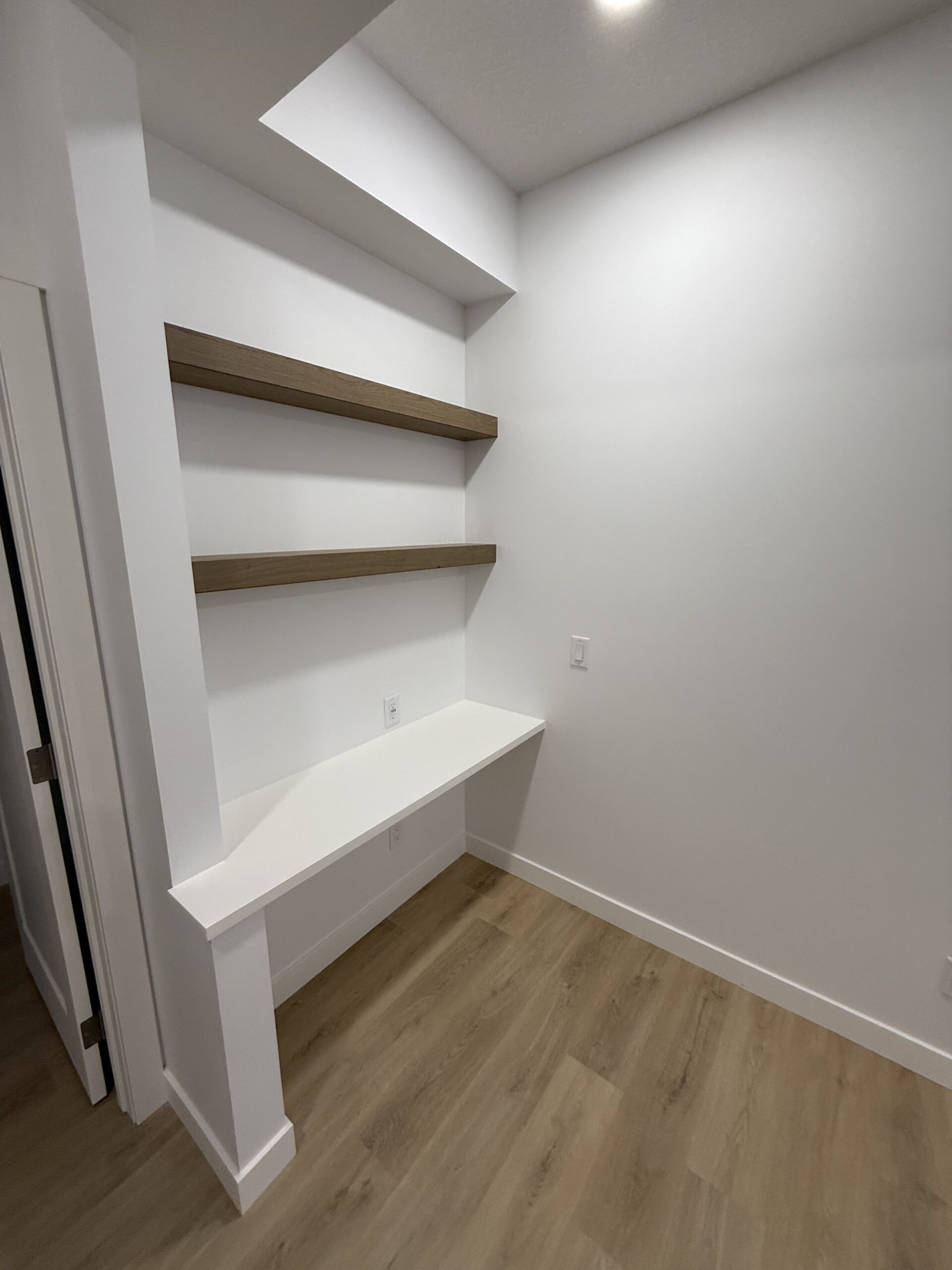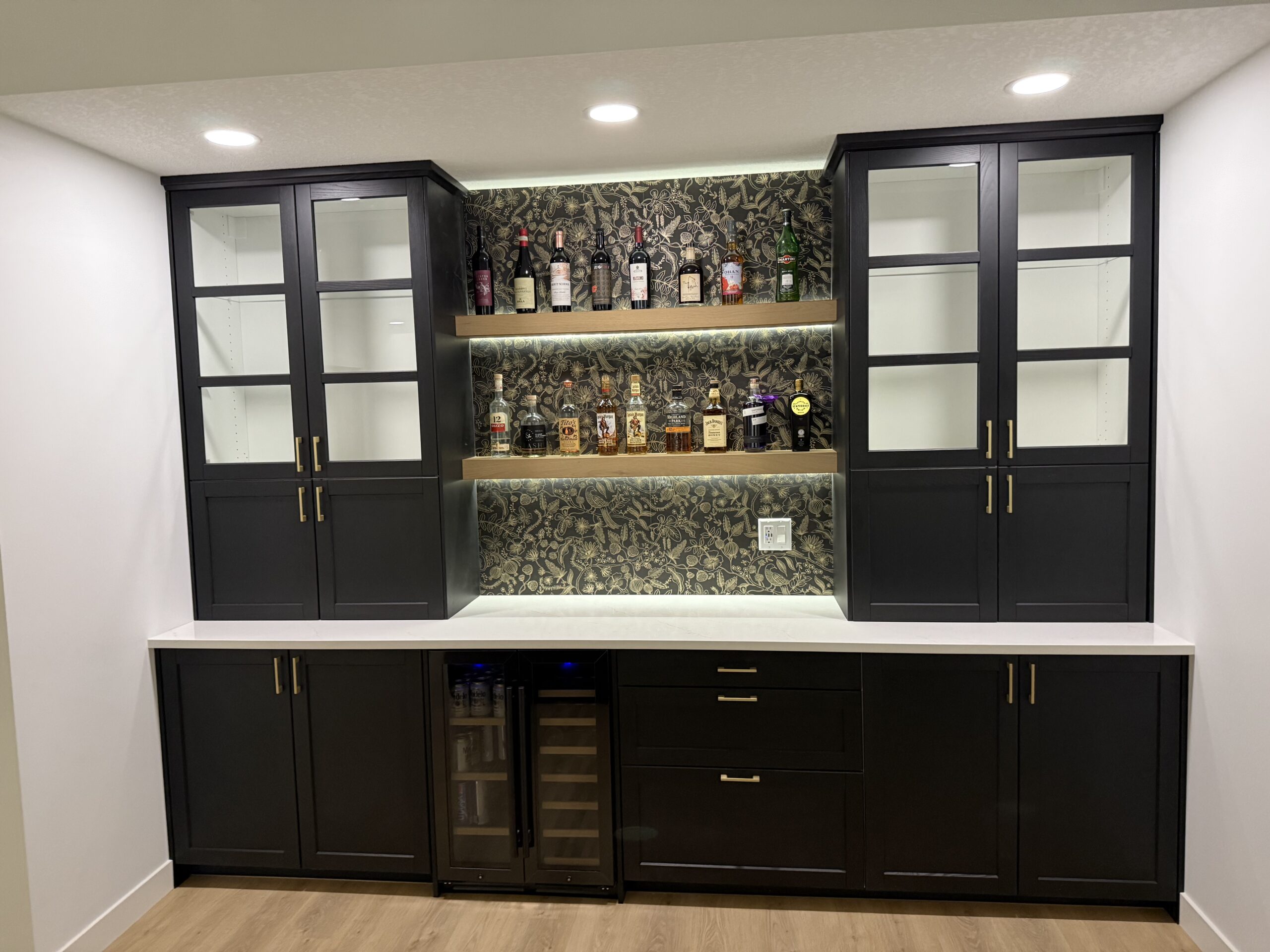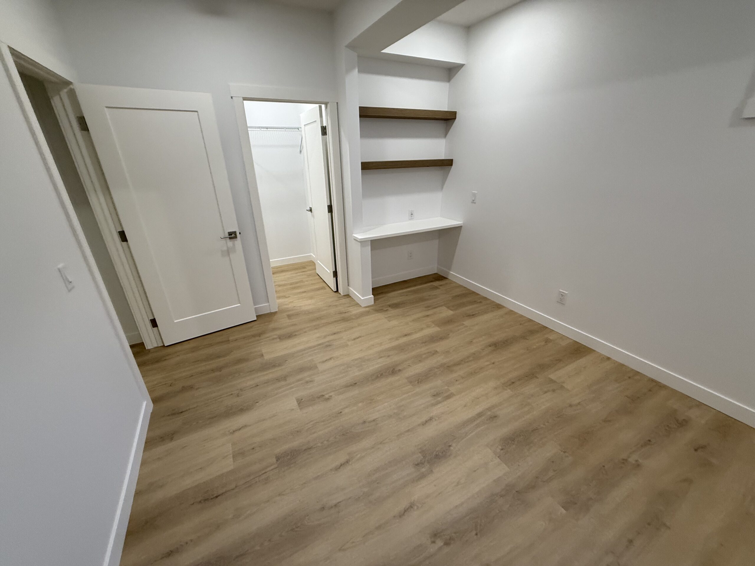 This Basement Development project features a very large open concept living area with many features including a custom steam shower, large bedroom with built in desk area, gym and dry bar.