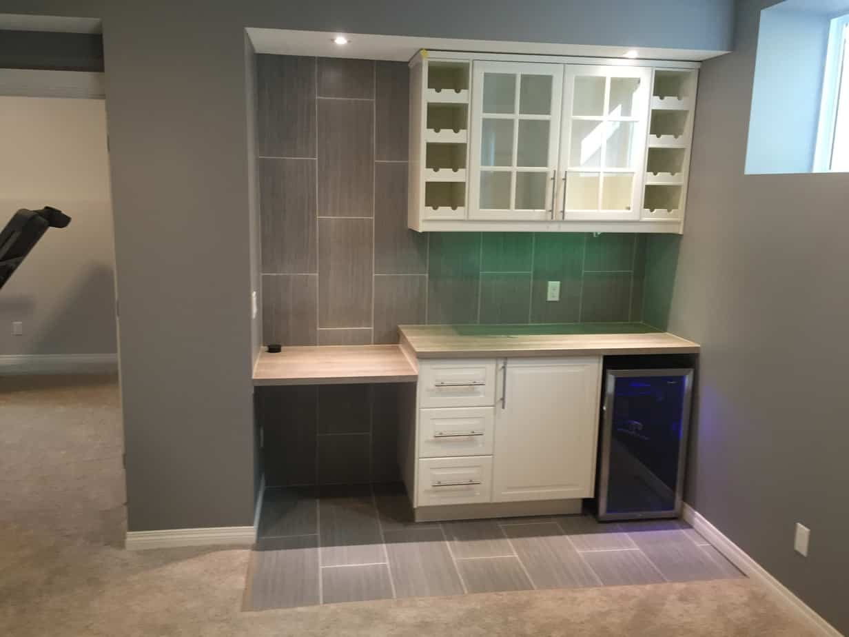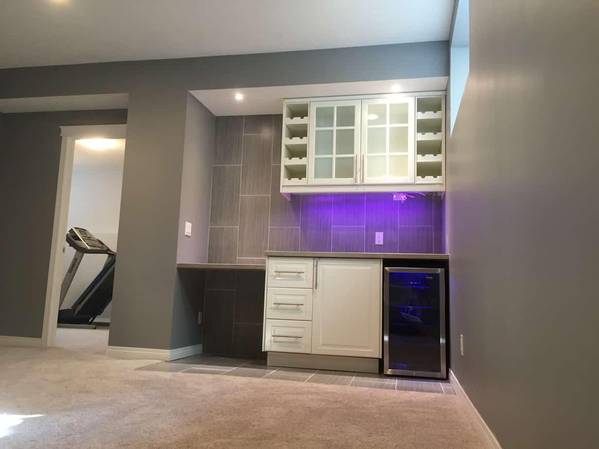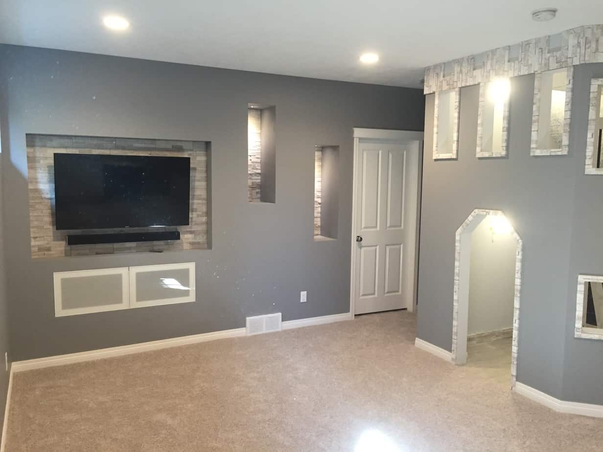 Ravenswood Our ravenswood basement development incorporated a 2 story castle playhouse along the stairs. A generous living area with dry bar and computer station welcome you to the lower level. The bathroom includes a custom shower with Calcutta tile and heated floors.